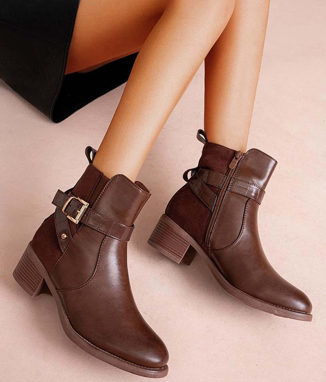 Alliant élégance et confort, ces bottines marron se distinguent par leur design bi-matière raffiné. Le corps principal est en simili cuir lisse et résistant, tandis que l’empiècement en effet daim (suédine) doux au toucher apporte une touche de sophistication et de modernité.